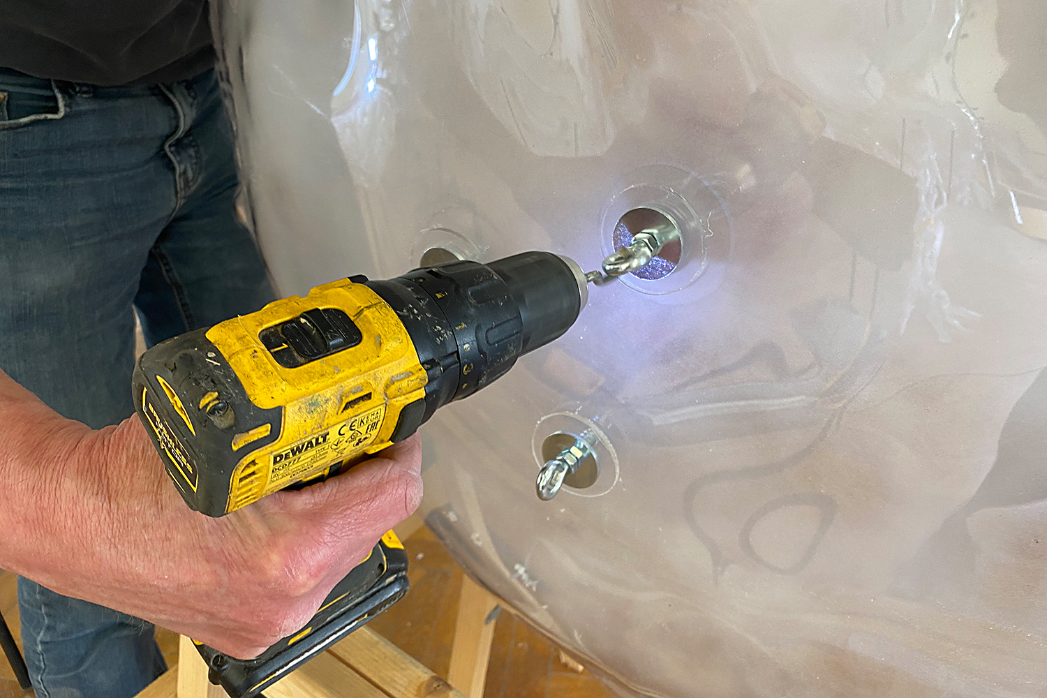 Installation der Haken, um die Quallen an den Seilen über der Oker aufhängen zu können. Bildnachweis: IAK/TU Braunschweig Vorheriges Bild Nächstes Bild Bitte beachten Sie das Copyright dieses Bildes.