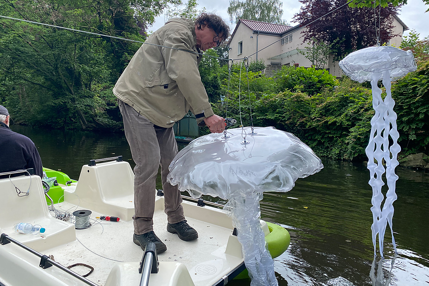 Etwas wackelig war der Aufbau mit Tretbooten auf der Oker. Bildnachweis: IAK/TU Braunschweig Vorheriges Bild Nächstes Bild Bitte beachten Sie das Copyright dieses Bildes.