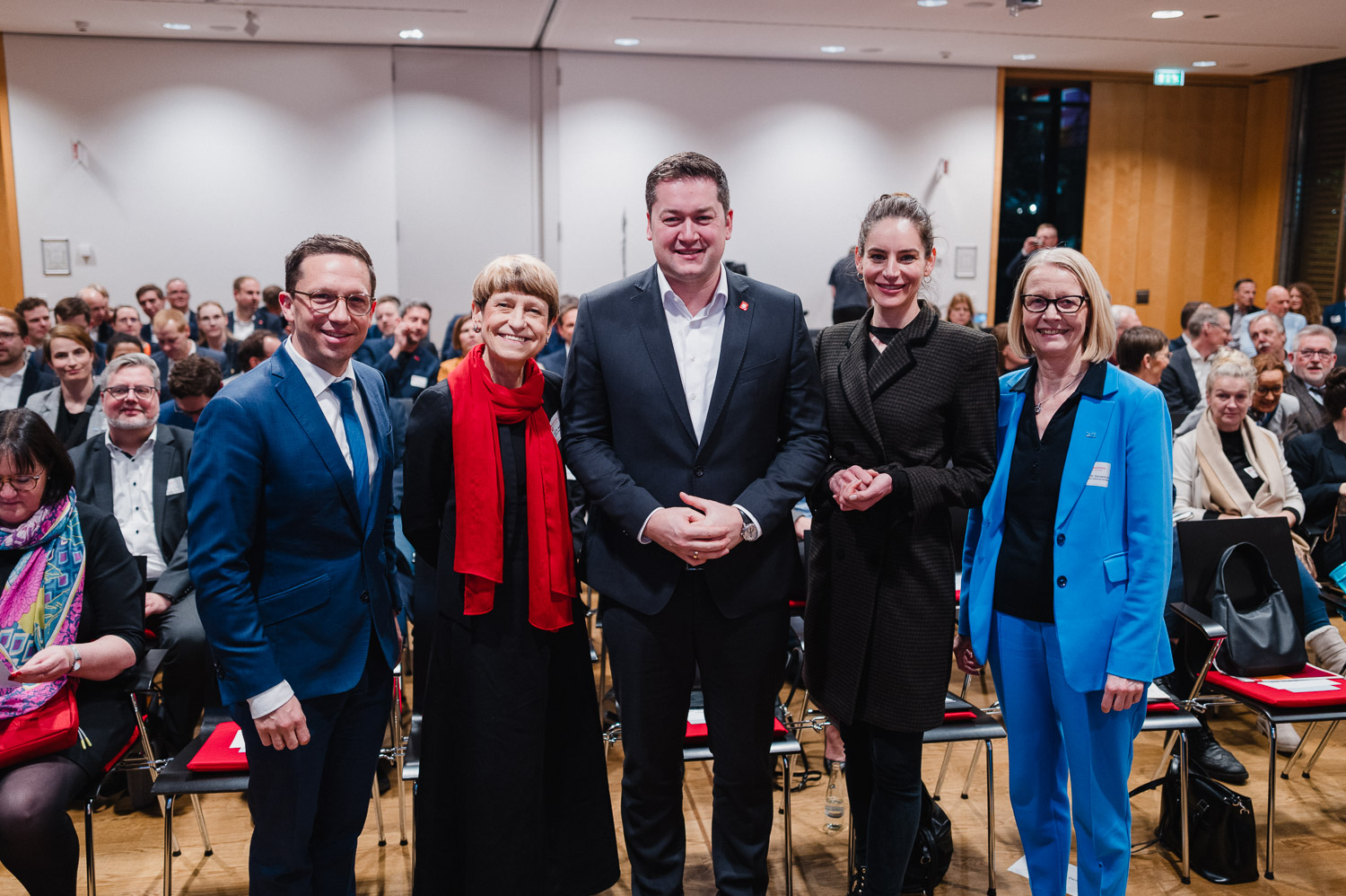 Parlamentarischer Abend 2025, v.l.n.r.: Falko Mohrs (Niedersächsischer Minister für Wissenschaft und Kultur), Prof. Dr. Angela Ittel (Präsidentin Technische Universität Braunschweig), Dr. Thorsten Kornblum (Oberbürgermeister Stadt Braunschweig), Dr. Alexandra-Gwyn Paetz (Abteilungsleiterin, Bundesministerium für Forschung, Technologie und Raumfahrt) und Prof. Dr. Cornelia Denz (Präsidentin Physikalisch-Technische Bundesanstalt)
