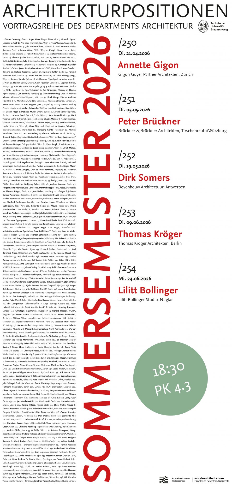 Die Vortragsreihe ARCHITEKTURPOSITIONEN des Departments Architektur präsentiert unter Intendanz des IAD renommierte internationale Architektinnen und Architekten, Planer und Theoretiker.