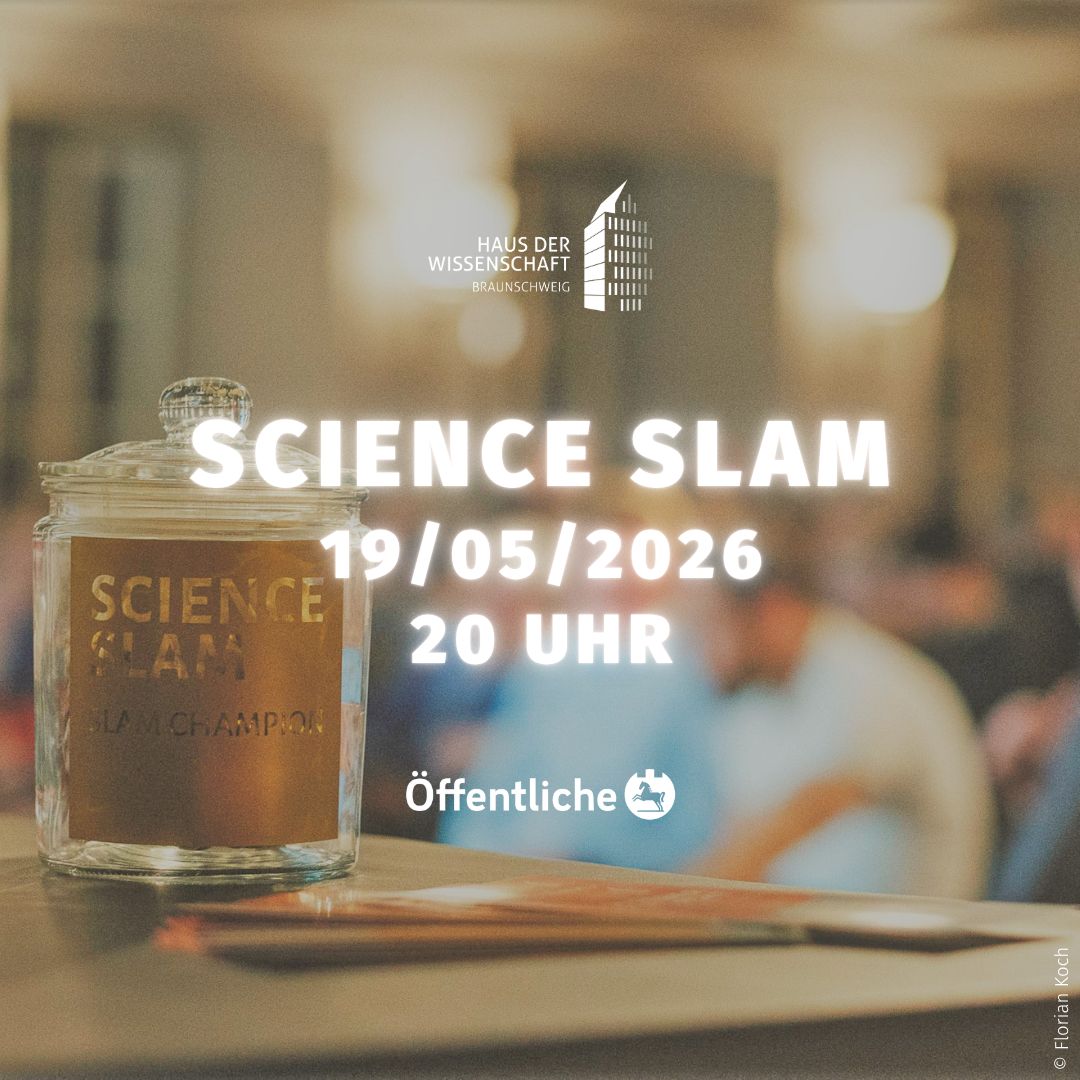 Am 19. Mai 2026 findet um 20:00 Uhr (Einlass: 19:30 Uhr) in der Aula (3. OG) des Haus der Wissenschaft die nächste Ausgabe unserer Science Slams statt. Auch dieses Mal werden euch Wissenschaftler*innen aus den verschiedensten Forschungsbereichen ihre Themen präsentieren. Wer am Ende gewinnt, entscheidet wie immer ihr mit euren Punkten und kürt so unseren Braunschweiger Slam Champion.