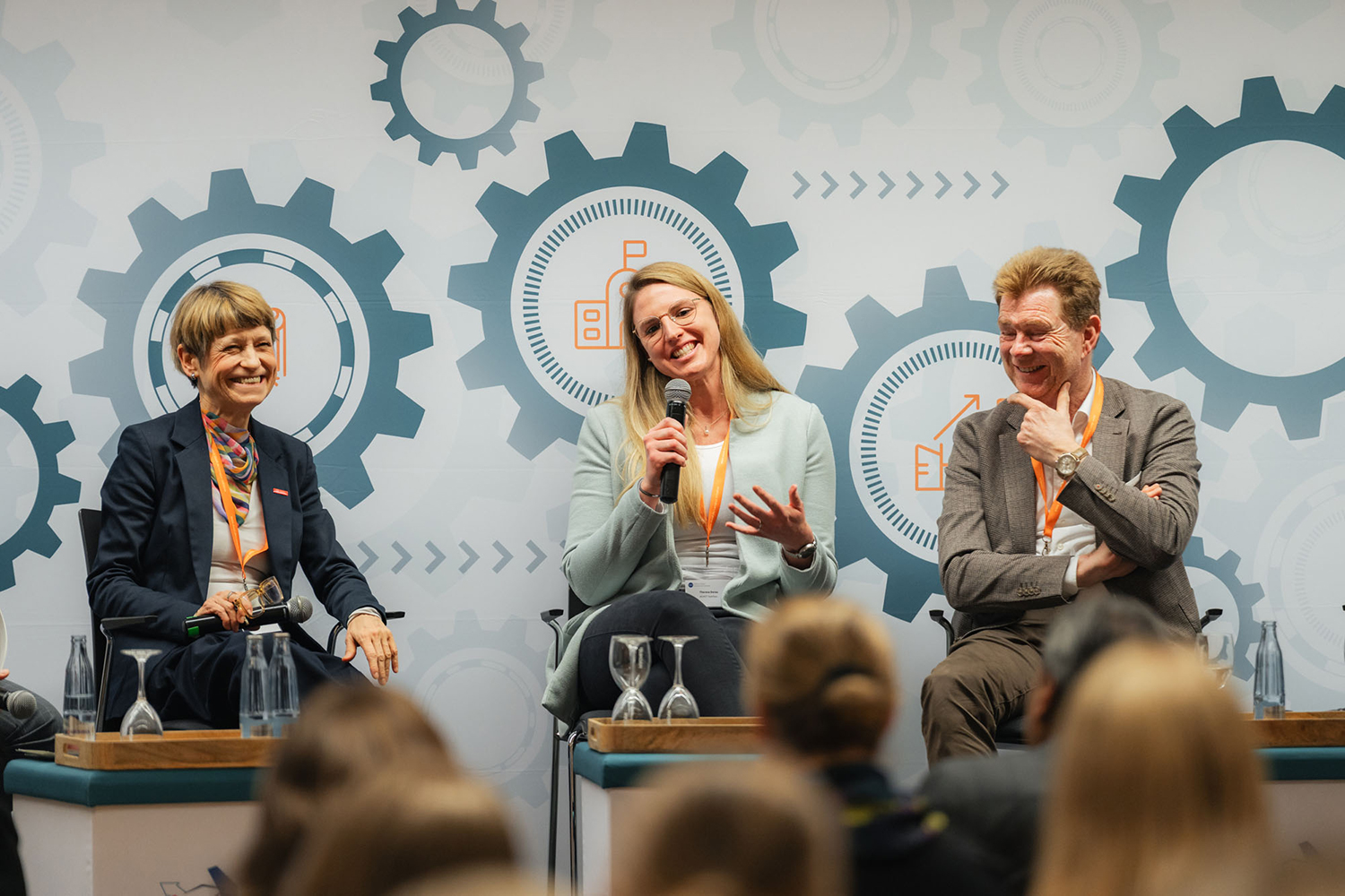 To highlight the perspective of international students, Dr Ksenia Zaytseva and Phyo Min Khaing then shared their experiences of entering the labour market and, in conversation with moderator Feridun Öztoprak, explained what had motivated them to stay in Germany. Both had completed their studies in Germany as international students. In a lively panel discussion that followed, Angela Ittel and Klaus Birk spoke with Prof. Dr. Tina Cornelius-Krügel (Lower Saxony Ministry of Science and Culture) as well as business representatives Theresa Dorau (WURST Stahlbau) and Thorsten Sponholz (Siemens Mobility Braunschweig) about the factors contributing to the successful integration of international students into the Lower Saxony labour market. The evening concluded with an exchange among the participants in the project gallery.
