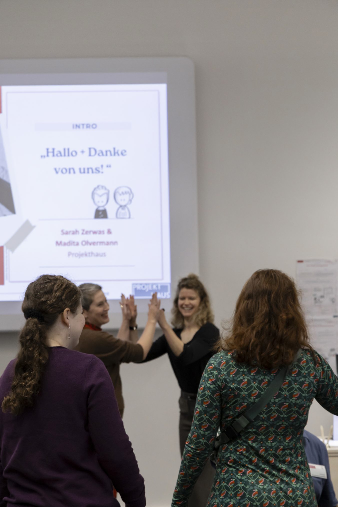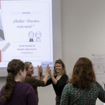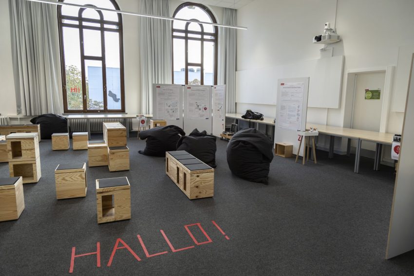 During the open exchange on the team islands after the short pitch rounds, the teams demonstrated their creativity and curiosity. My colleague Sarah Zerwas and I once again made it clear to today’s participants how much fun we had supporting the teams in workshops, work meetings, feasibility walks and poster production in our role as process facilitators over the past few months. Despite varying workloads and levels of frustration, we are grateful that everyone put so much energy and commitment into the project. We were thrilled by the enthusiasm for design. This was celebrated with a high five at the start of the event.
