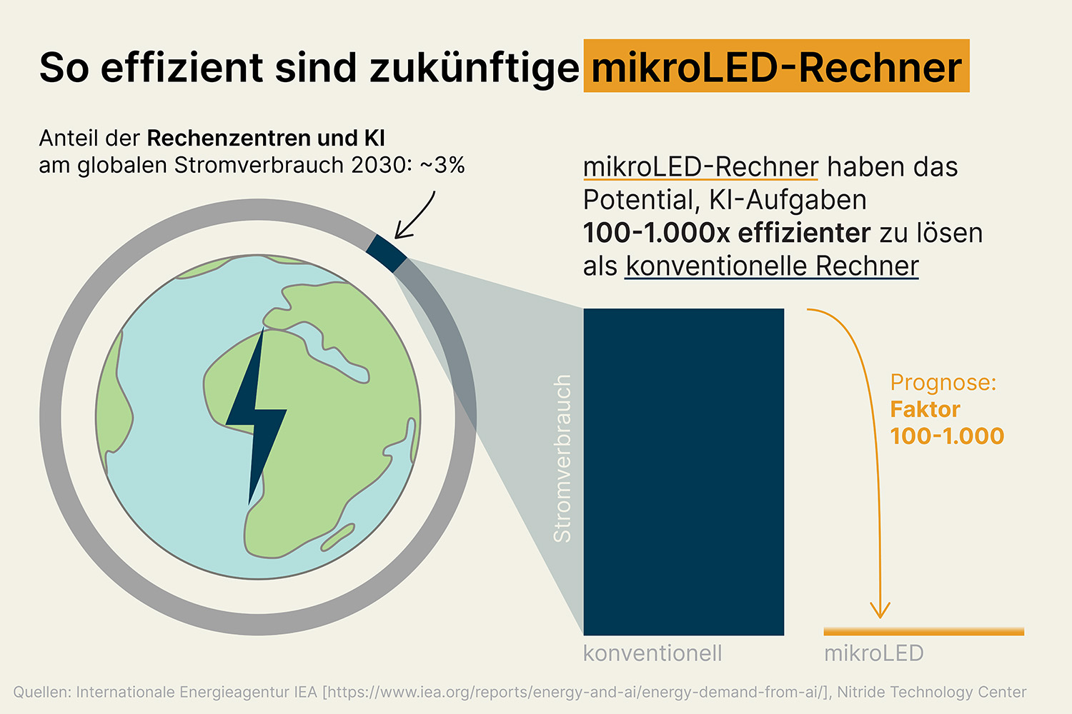 The global energy demand of data centres is growing four times faster than in all other sectors, driven by AI applications. According to the International Energy Agency (IEA) scenario, data centres will consume three per cent of global electricity – roughly double the current total consumption of Germany. This enormous energy hunger is primarily due to the simulation of neural networks. In order to recognise a pattern, for example, classic computers have to break down all data into 0s and 1s, complete as many training runs as possible with large data sets, and process them in a multi-stage process.