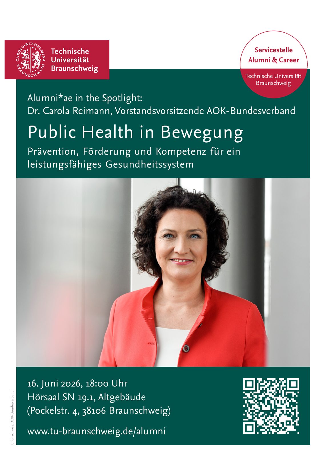 Was hat Public Health mit meinem Studium, meinem Beruf und sozialer Gerechtigkeit zu tun? Genau dieser Frage geht Dr. Carola Reimann, Vorstandsvorsitzende des AOK-Bundesverbandes und Alumna der TU Braunschweig, in ihrem Vortrag nach. Sie zeigt, wie wichtig Gesundheitsförderung, Prävention und Gesundheitskompetenz für ein leistungsfähiges und effizientes Gesundheitswesen und das Solidarsystem der Gesetzlichen Krankenversicherung sind – und warum dies eine Schlüsselaufgabe für die nächsten Jahrzehnte ist.