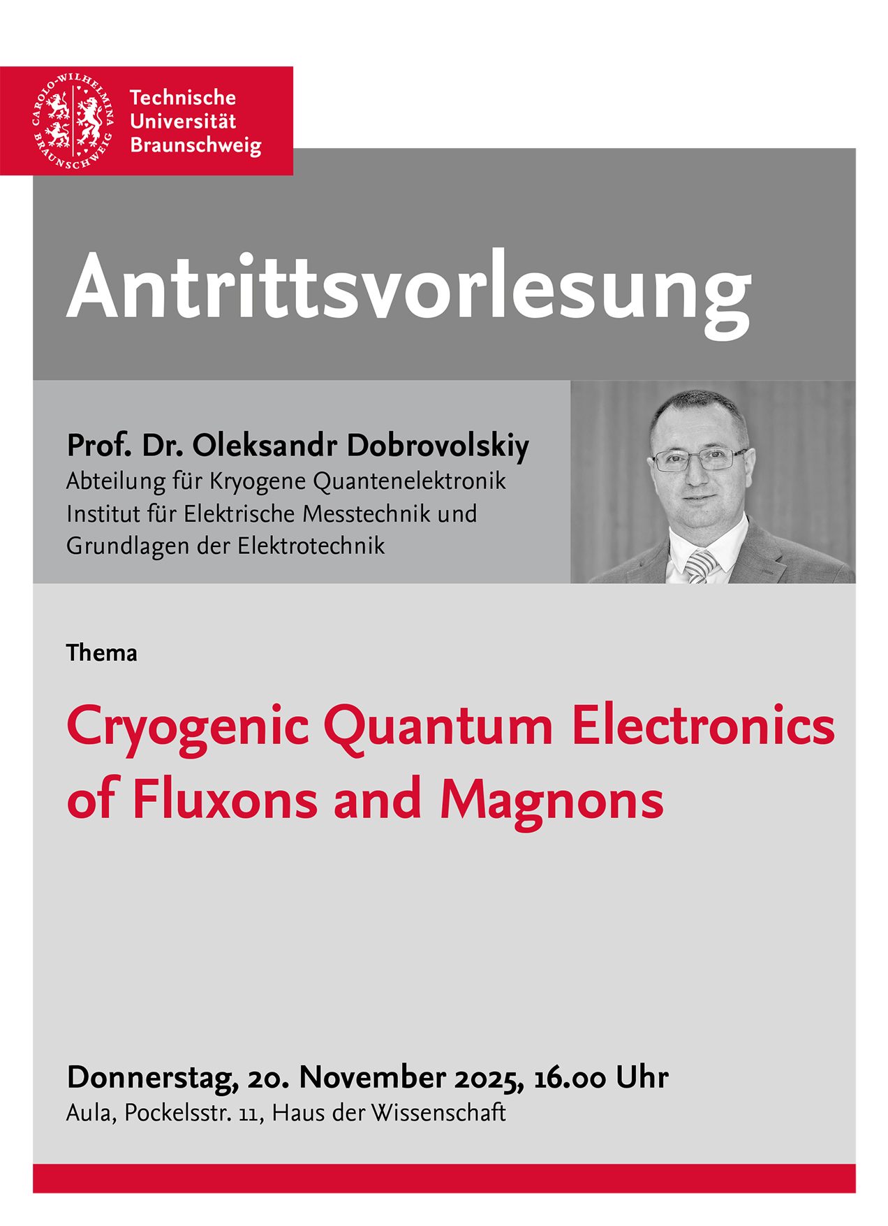 Seit Juli 2024 ist Oleksandr Dobrovolskiy Professor an der Technischen Universität Braunschweig. Er leitet die Abteilung für Kryogene Quantenelektronik am Institut für Elektrische Messtechnik und Grundlagen der Elektrotechnik sowie im Laboratory for Emerging Nanometrology (LENA). Seine Gruppe ist in das Exzellenzcluster QuantumFrontiers, die Braunschweiger Internationale Graduiertenschule für Metrologie und mehrere europäische Forschungsnetzwerke eingebunden. In seiner Antrittsvorlesung stellt Oleksandr Dobrovolskiy die Forschungsgebiete der Fluxonik und Magnonik vor und hebt einige kürzlich entdeckte Phänomene an deren Schnittstelle hervor.