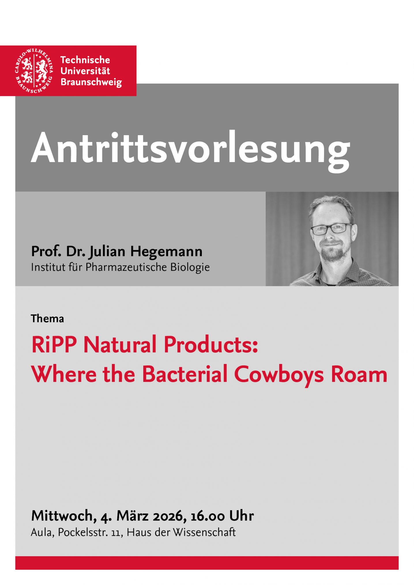 Ob Sie wollen oder nicht – diese Vorlesung werden Sie mit dem Wissen verlassen, welche RiPP-Naturstoffe in Milchprodukten als natürliche Konservierungsmittel seit fast 60 Jahren genutzt werden, wie bakterielle Cowboys in unserem Verdauungstrakt pathogenen Outlaws und Halunken mit ihren Lassopeptiden das Handwerk legen und wie all dieses Wissen an der TU Braunschweig für moderne Forschungskonzepte eingesetzt wird.
