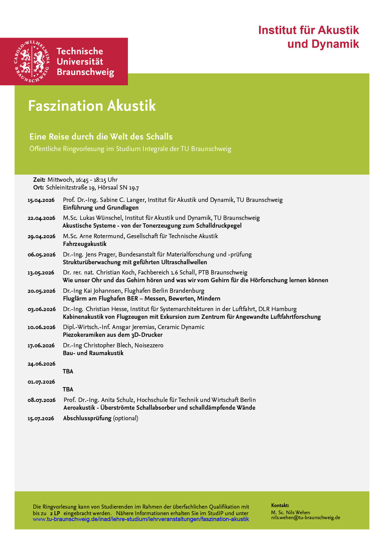 Die Vortragsreihe „Faszination Akustik“ greift die vielschichtigen Aspekte der Welt der Akustik auf und wird durch zwei einführende Vorlesungen in die Grundlagen der Akustik eingeleitet. Die Vortragenden kommen sowohl aus dem universitären Forschungsumfeld als auch aus der industriellen Anwendung und präsentieren ihre Arbeitsgebiete und damit eine Vielzahl verschiedener Aspekte der Akustik auf anschauliche Weise. Außerdem werden im Rahmen einer Exkursion Einblicke in die Arbeit des Zentrums für Angewandte Luftfahrtforschung in Hamburg gewährt.