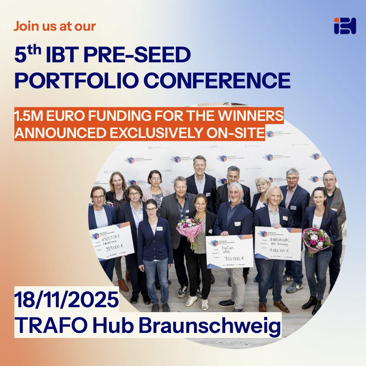 We are excited to invite you to the 5th IBT Lower Saxony Portfolio Conference – our event highlight for showcasing breakthrough biomedical innovations and announcing our next projects. The event will feature seven teams competing for up to €1.5 million in funding as they pitch their startup ideas.