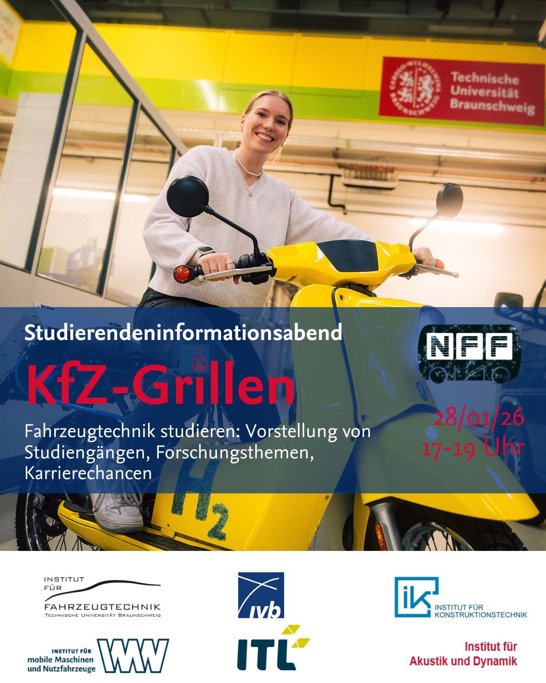 Forschung hautnah, Technik zum Anfassen und bei Wurst und Bier Kontakte knüpfen: Das sogenannte „KfZ-Grillen“ am Mittwoch, 28. Januar 2026 lädt Studierende von 17:00 bis 19:00 Uhr ein, sich am NFF über aktuelle Forschungsprojekte, innovative Technologien und vielfältige Perspektiven in der Fahrzeugtechnik zu informieren.