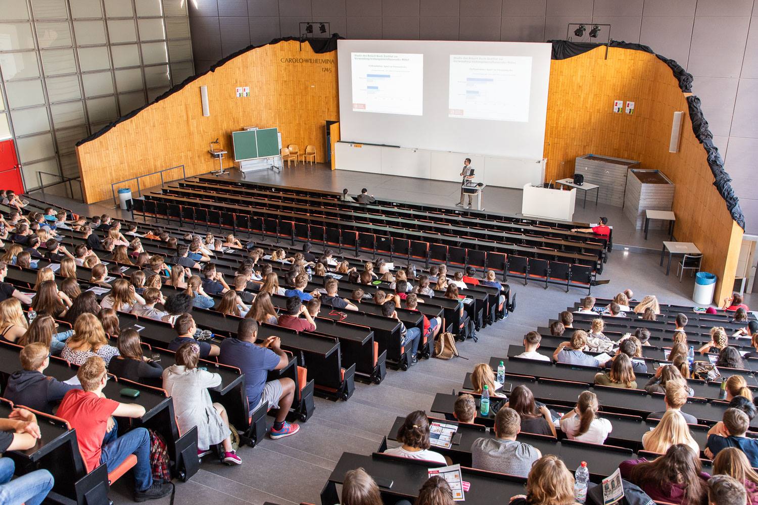 Bei Schnuppervorlesungen konnten die Schülerinnen und Schüler Hochschulluft schnuppern, wie hier im Audimax. Bildnachweis: Markus Hörster/TU Braunschweig Vorheriges Bild Nächstes Bild Bitte beachten Sie das Copyright dieses Bildes.