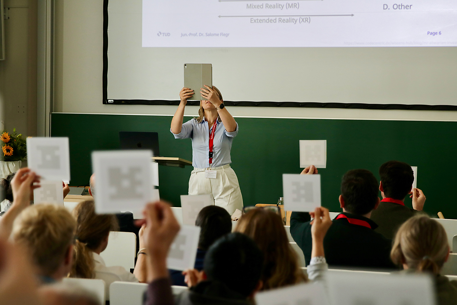 In der Keynote von Juniorprofessorin Salome Flegr (TU Dresden) wurde das Publikum interaktiv eingebunden und es wurden Standpunkte zur Rolle von XR-Technologien eingeholt. Bildnachweis: INTERXR