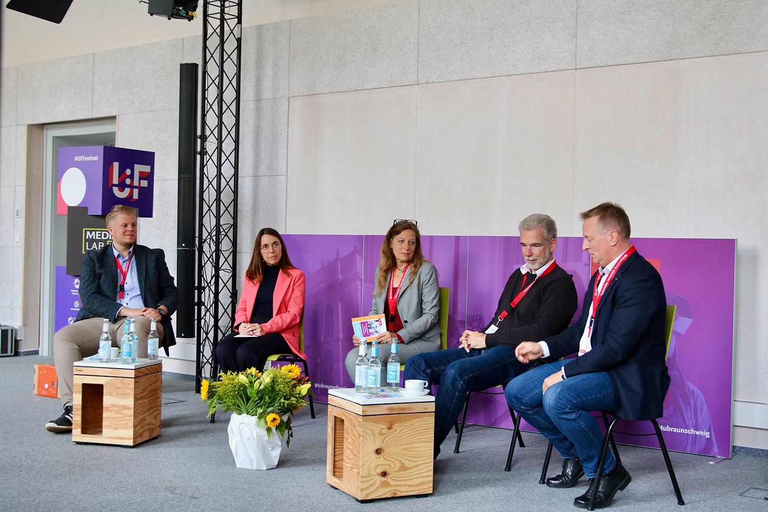Zum Abschluss der Tagung diskutierten Projektbeteiligte über aktuelle Forschungsschwerpunkte für XR in der Bildung (v. l.): Prof. Dr. Alexander Büssing, Dr. Katja Knecht, PD Dr. Dagmar Hilfert-Rüppell, Prof. Dr. Marcus Magnor, Prof. Dr. Stefan Heuser. Bildnachweis: INTERXR