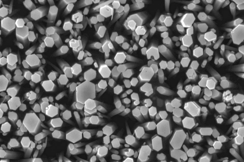 Von oben sieht man hervorragend die hexagonale Kristallstruktur der Nanodrähte. Je dünner die Drähte dabei wachsen, ohne zu brechen, desto besser ist die potenzielle Stromerzeugung. Bildnachweis: Frank Anang/TU Braunschweig