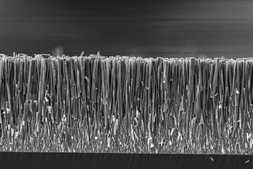 Von der Seite betrachtet ähneln die Nanodrähte einer Bürste – nur, dass diese Bürste kleiner ist als ein weißes Blutkörperchen. Mit Goldplatten als Elektroden an der Ober- und Unterseite bedeckt, wandeln die Drähte Druck in eine geringe Spannung um. Bildnachweis: Frank Anang/TU Braunschweig