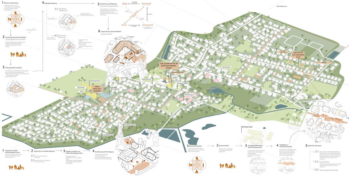 Strategien zum Umgang mit dem Klimawandel werden ebenso behandelt wie aktuelle Herausforderungen und Potenziale der Regionalentwicklung im ländlichen Raum, als auch Ansätze für eine gemeinnützige und zukunftsfähige Bodenpolitik. Im Mittelpunkt stehen dabei unter anderem Überlegungen zu Formen zukünftiger Nahrungsmittelproduktion und welche räumlichen und gestalterischen Folgen dies haben kann. Die Ergebnisse ihrer Arbeit vermitteln die Studentinnen über leicht verständliche, visuell ansprechende Grafiken und machen so vielschichtige Inhalte für Laien gut zugänglich. Damit schufen sie die Grundlage für die Entwicklung neuer Gemeinschaften, die vor Ort auf große Resonanz traf.