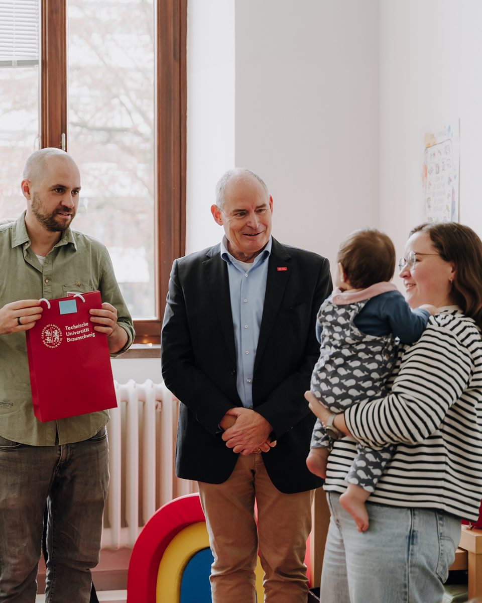 Kleine Gäste ganz groß: Beim traditionellen Willkommensgespräch für frischgebackene Eltern standen die TU-Babys im Mittelpunkt. Dietmar Smyrek, Vizepräsident für Personal, Finanzen und Hochschulbau, begrüßte die Familien im Eltern-Kind-Raum im Altgebäude der Technischen Universität Braunschweig – ein Ort, der Austausch und Vernetzung in familiärer Atmosphäre ermöglicht.