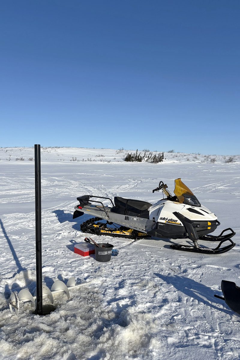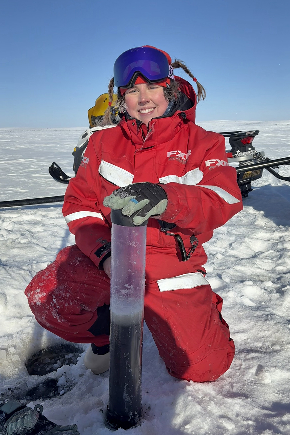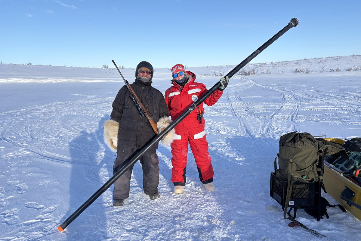 März 2025, Mackenzie-Delta, kanadische Arktis: Emma Cameron steht in der Mitte eines zugefrorenen Sees, vor sich ein Loch im Eis. Langsam lässt sie ein Seil aus ihrer Hand in das dunkle Wasser gleiten – und mit ihm ein schweres Gerät, einen Sedimentkernbohrer. Ähnlich wie ein Bohrer in eine poröse Wand dringt er immer tiefer in den Grund des Sees.