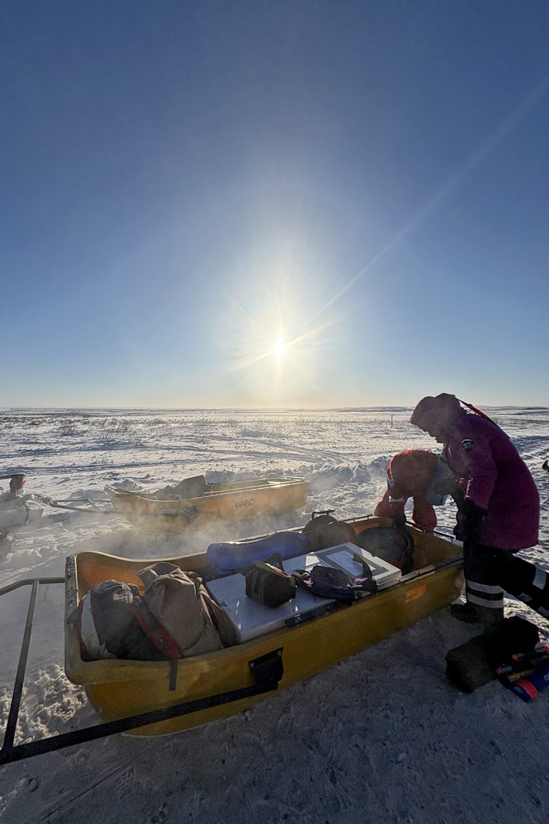 Dort arbeiten sie eng mit der arktischen Gemeinschaft zusammen. Davon profitieren beide Seiten gleichermaßen. „Als mein GPS durch die Kälte ausfiel, hätte ich mich in der unendlichen weißen, flachen Landschaft ohne die einheimischen Kolleg*innen nicht orientieren können“, erinnert sich Cameron. Eine gezielte Probenentnahme wäre ohne diese Unterstützung kaum möglich gewesen. Außerdem hätten die Wissenschaftler*innen nicht halb so viele Wildtiere gesehen.