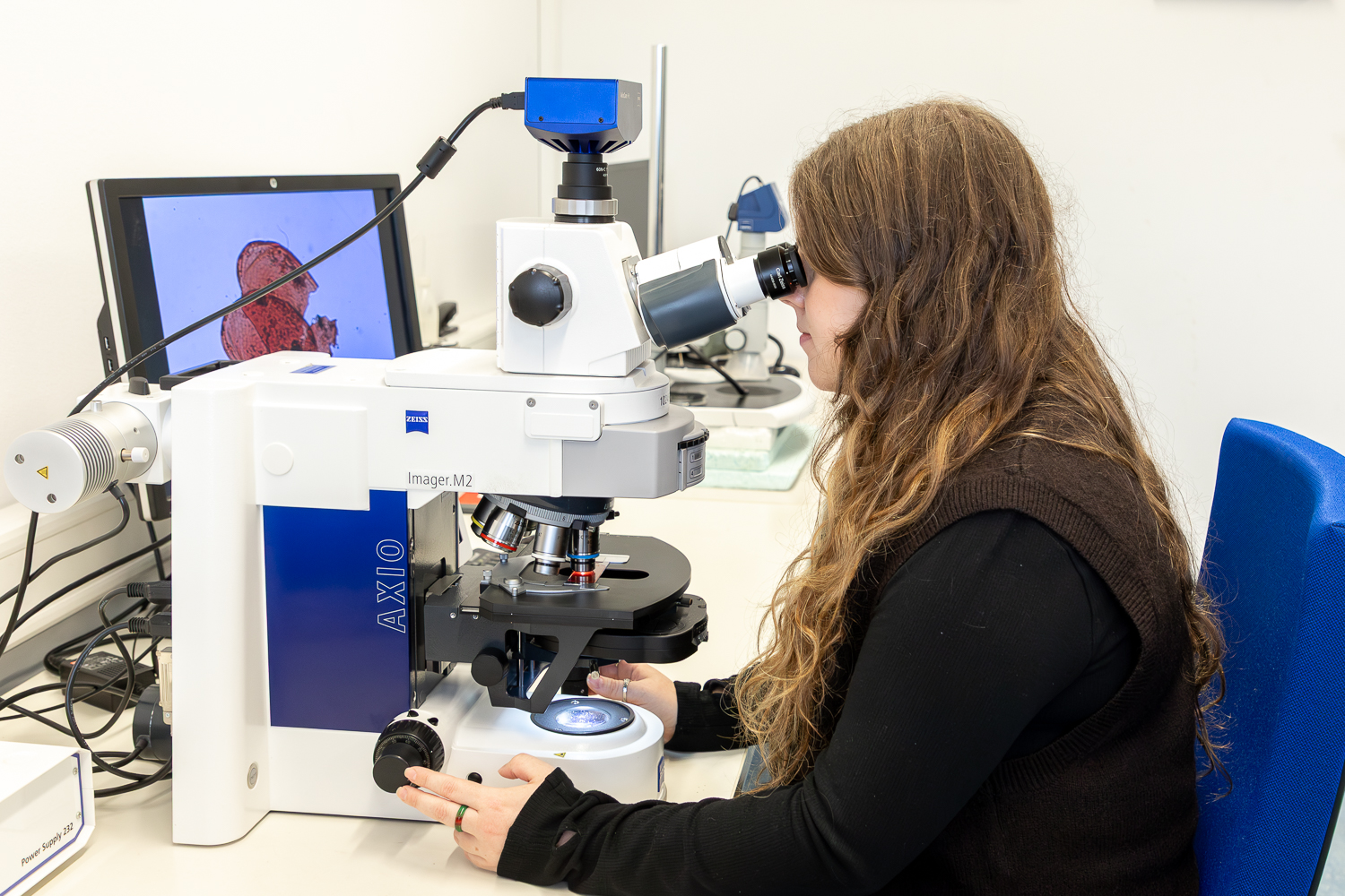 Unter dem Lichtmikroskop untersucht Emma Cameron die Überreste kleiner Tiere im Sediment. Bildnachweis: Kristina Rottig/TU Braunschweig.