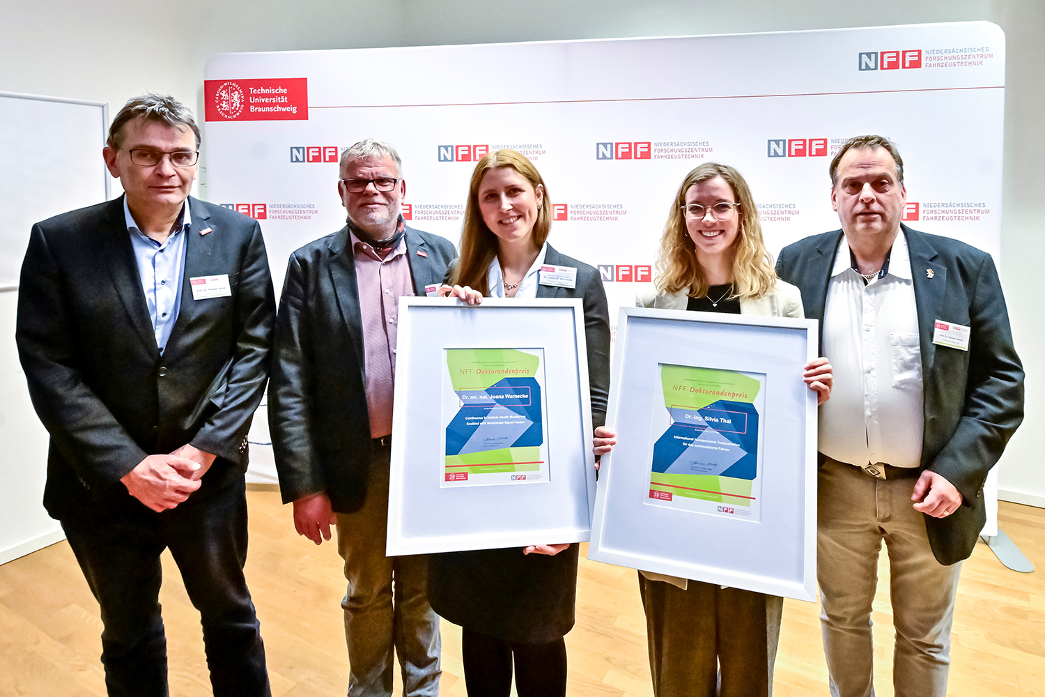 Um die Nachwuchsforschung am Niedersächsischen Forschungszentrum Fahrzeugtechnik (NFF) der Technischen Universität Braunschweig noch sichtbarer zu machen, werden alle zwei Jahre die NFF-Doktorandenpreise verliehen. Am 11. November 2025 wurden zwei Preise vergeben: Den mit 4.000 Euro dotierten ersten Platz belegte Dr.-Ing. Silvia Thal, und den mit 1.000 Euro dotierten zweiten Platz Dr. Joana M. Warnecke. Beide Dissertationen widmen sich der Mobilität der Zukunft. Silvia Thal behandelt in ihrer Dissertation den Aufbau einer grundlegenden Methode zum Sicherheitsnachweis von hochautomatisierten Fahrfunktionen, Joana Warnecke hat ein Konzept zum kontinuierlichen Gesundheitsmonitoring durch verschiedene Mobilitätsträger entwickelt.