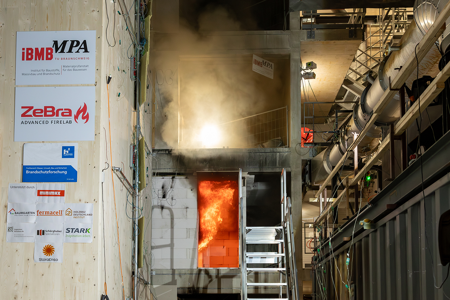 Für die Versuchsreihe im Realmaßstab wurde an das sogenannte Brandhaus im Zentrum für Brandforschung der TU Braunschweig ein viergeschossiger, rund zwölf Meter hoher Treppenraum angebaut. In jeder Etage verbinden zwei Türen das Treppenhaus direkt mit einem angrenzenden Raum im mehrgeschossigen Brandhaus, in dessen erster Etage der Brand entfacht wurde.