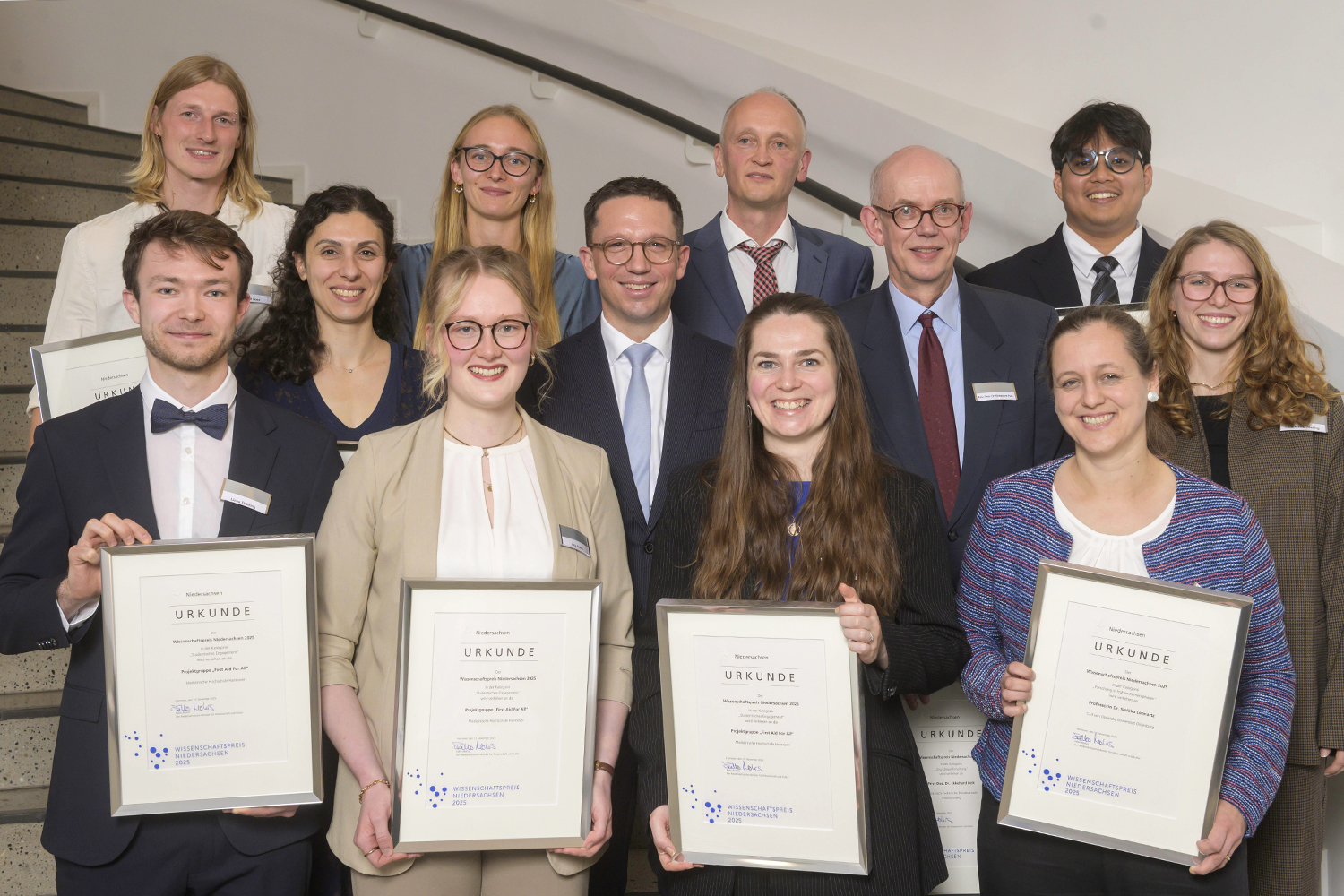 Der Niedersächsische Wissenschaftspreis wird seit 2007 verliehen – seit diesem Jahr erstmals in fünf verschiedenen Kategorien. Die Preisträger*innen werden von den niedersächsischen Hochschulen beziehungsweise außeruniversitären Einrichtungen vorgeschlagen und von der Wissenschaftlichen Kommission Niedersachsen ausgewählt. Für die Kategorie „Lehre“ war eine gesonderte Jury tätig. Die TU Braunschweig war mehrfach mit Preisträger*innen vertreten, zuletzt mit Prof. Andreas Waag, Prof. Patrick Schwerdtner und Sarah Koop-Brinkmann (2024), Prof. Franziska Neumann und Antonia Schultz (2023), Mandy Hoffmann (2022) sowie Prof. Arno Kwade und der Studierendeninitiative MethodAid (2021).