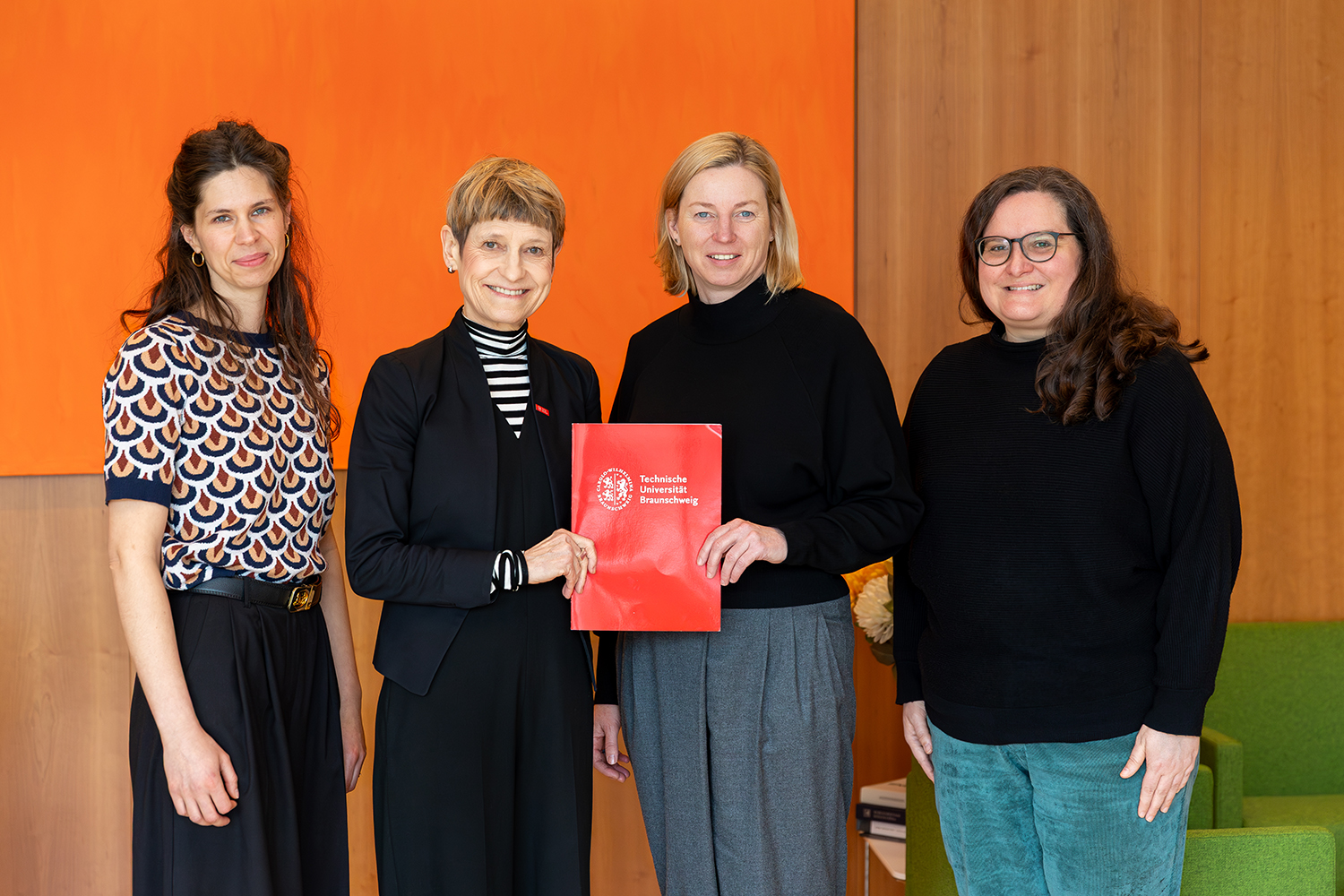 Franca Özkan (Antidiskriminierungsstelle Braunschweig), Prof. Angela Ittel (Präsidentin TU Braunschweig), Kersten Hartmann-Moos (VHS Braunschweig), Theresa Wegner (stellvertretend für Anouk Almstedt, TU Braunschweig/Strategische Hochschulentwicklung). Bildnachweis: Kristina Rottig/TU Braunschweig
