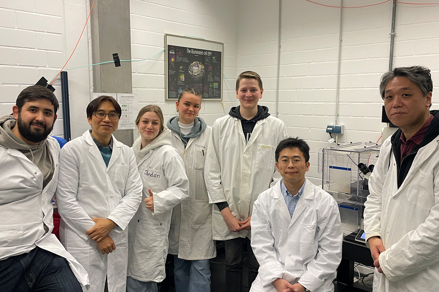 Nach der Nach dem Mikroscopy-Imagibng mit den Studierenden: Von links: 2. – Prof. Yamagishi (HUSM), 2. von rechts – Dr. Wakayama (HUSM), 3. von rechts – Michel Rebock (TU Braunschweig), ganz rechts – Dr. Namikawa (TU Braunschweig).Bildnachweis: Kazuhiko Namikawa Bildnachweis: Kazuhiko Namikawa