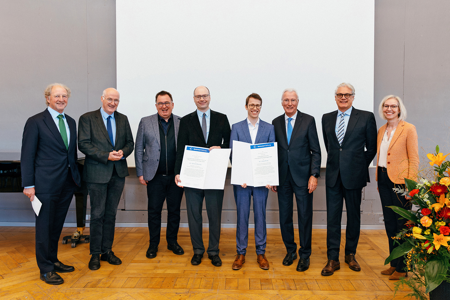 v.l.n.r.: Carl Pinnekamp (Stiftungskuratorium), Pater Martin Löwenstein SJ (Vorsitzender des Stiftungskuratoriums), Pater Johann Spermann (Stiftungsvorstand), Dr. Lennart Brewitz und Dr. Lukas Ernst (Preisträger), Hermann-Ulrich Viskorf (Vorsitzender des Stiftungsvorstandes), Rainald Gehringhoff (Stiftungskuratorium) und Dr. Lilian Klewitz-Haas (Stiftungsvorstand). Bildnachweis: Rottendorf Stiftung / Fotos: ZANAPHOTOS Žana Jozeljić