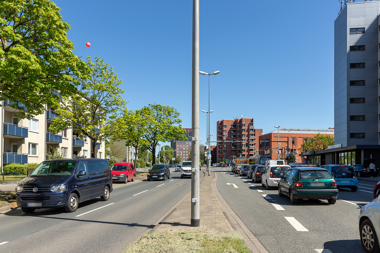 Forschungskreuzung in Braunschweig: In der ersten von vier Messkampagnen sammeln Feinstaubsensoren Daten. Links oben im Bild: Der Messballon der TU Braunschweig, ebenfalls ausgestattet mit Sensoren zur Feinstaubmessung in Höhen zwischen 5 und 150 Metern. Bildnachweis: Kristina Rottig/TU Braunschweig